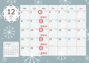12月3日(水)、10日(水)、17日(水)、24日(水)、31 日(水)は定休日となります。